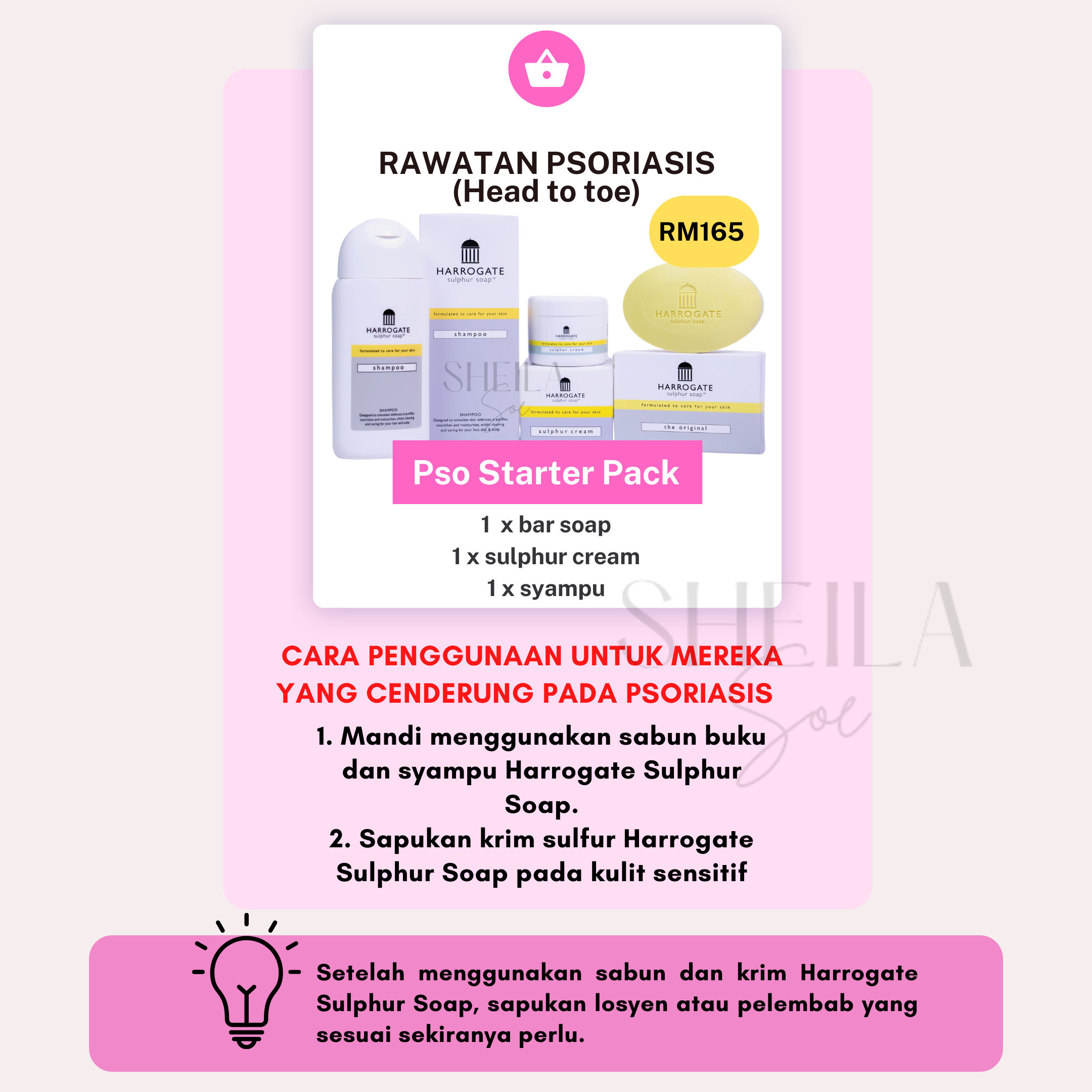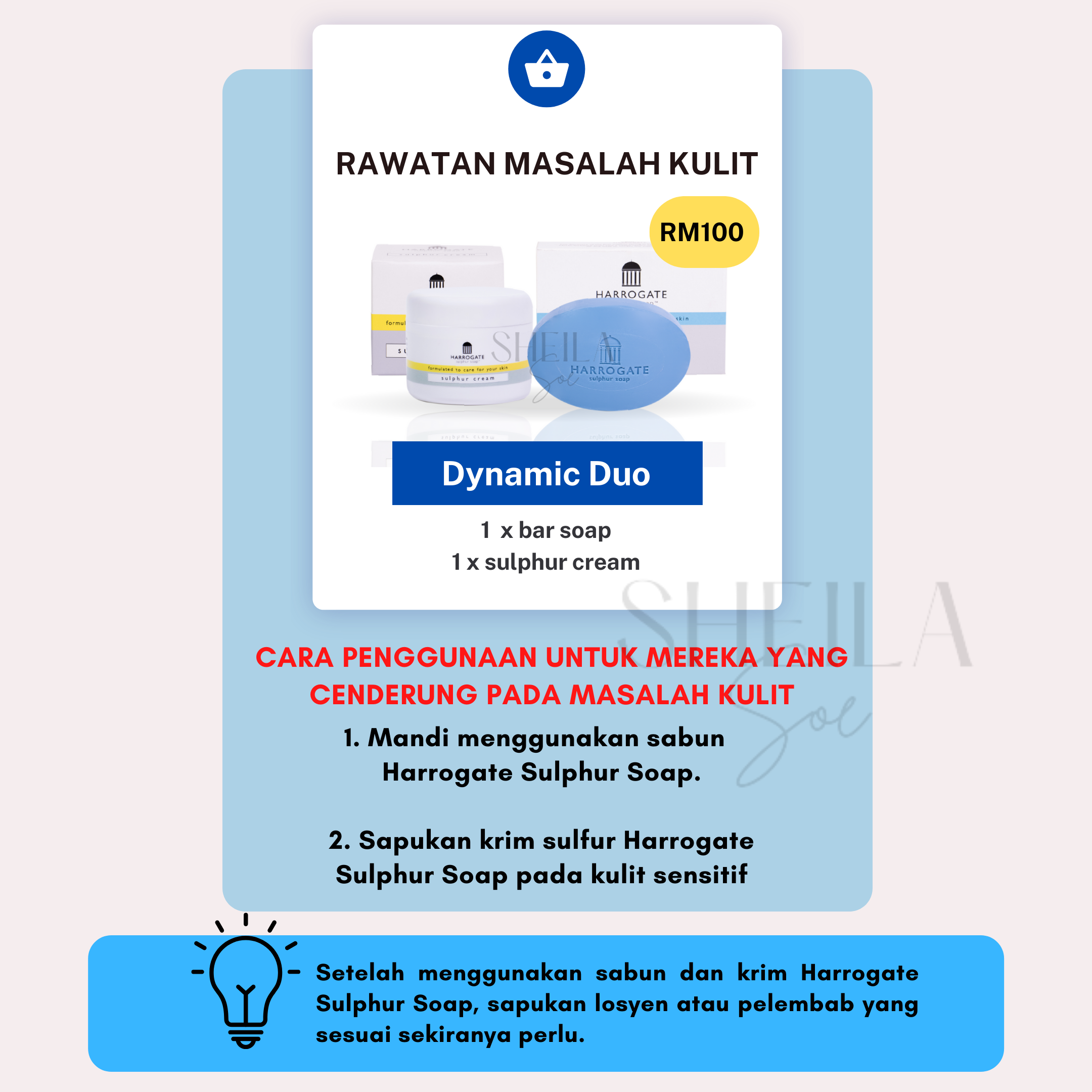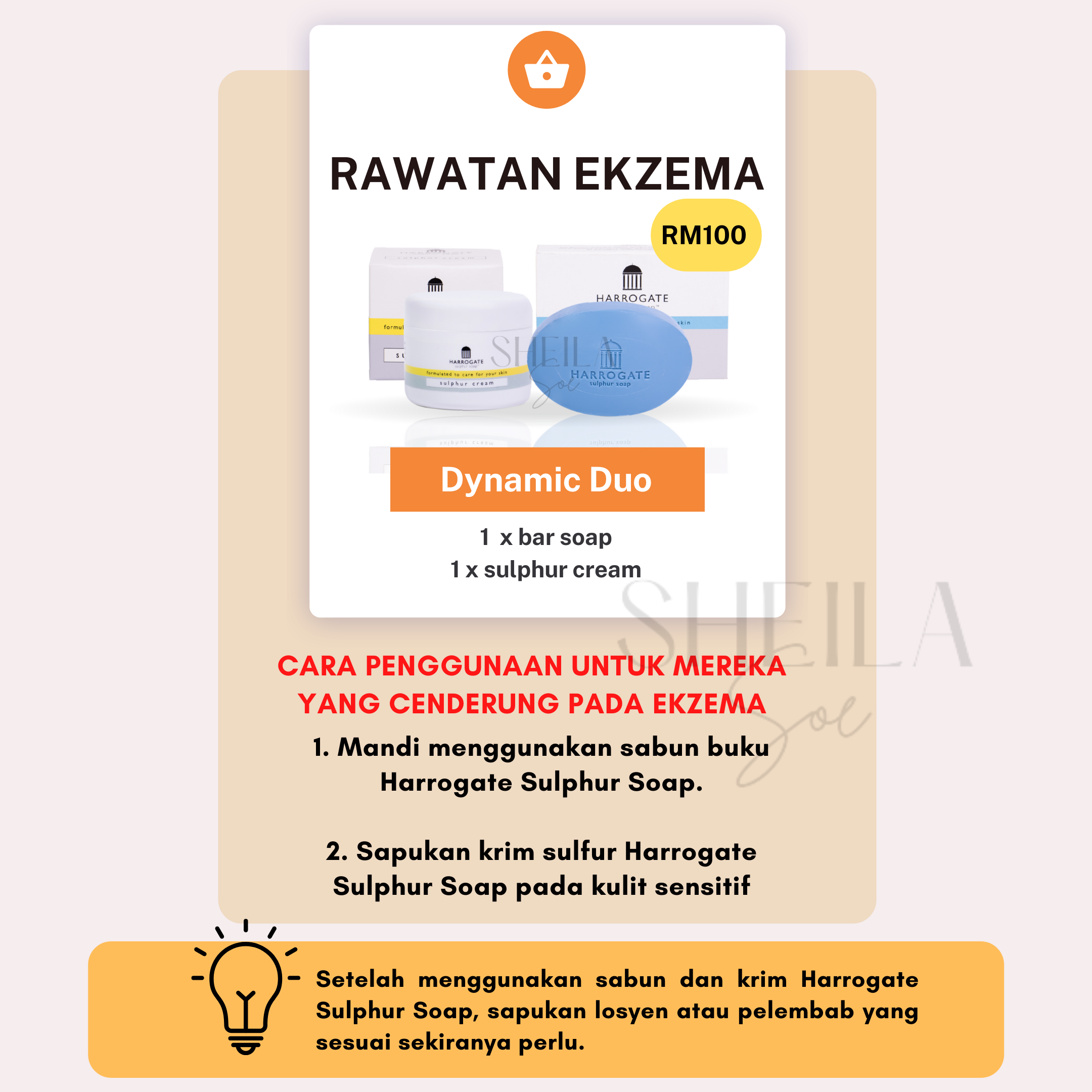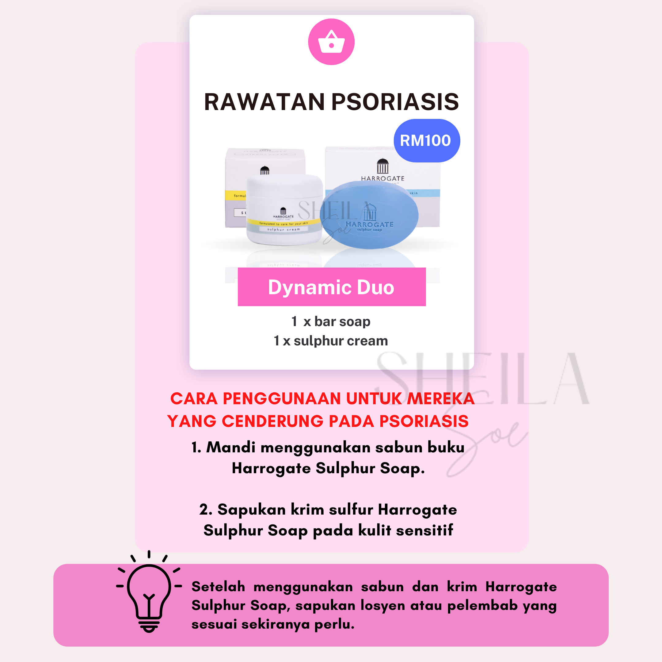 Untuk merawat masalah kulit seperti ekzema, psoriasis dan jerawat, anda dinasihatkan menggunakan bar soap & krim sulfur. Ini kerana, penggunaan kedua-dua produk ini secara konsisten dapat membantu memulihkan masalah kulit anda dengan berkesan.