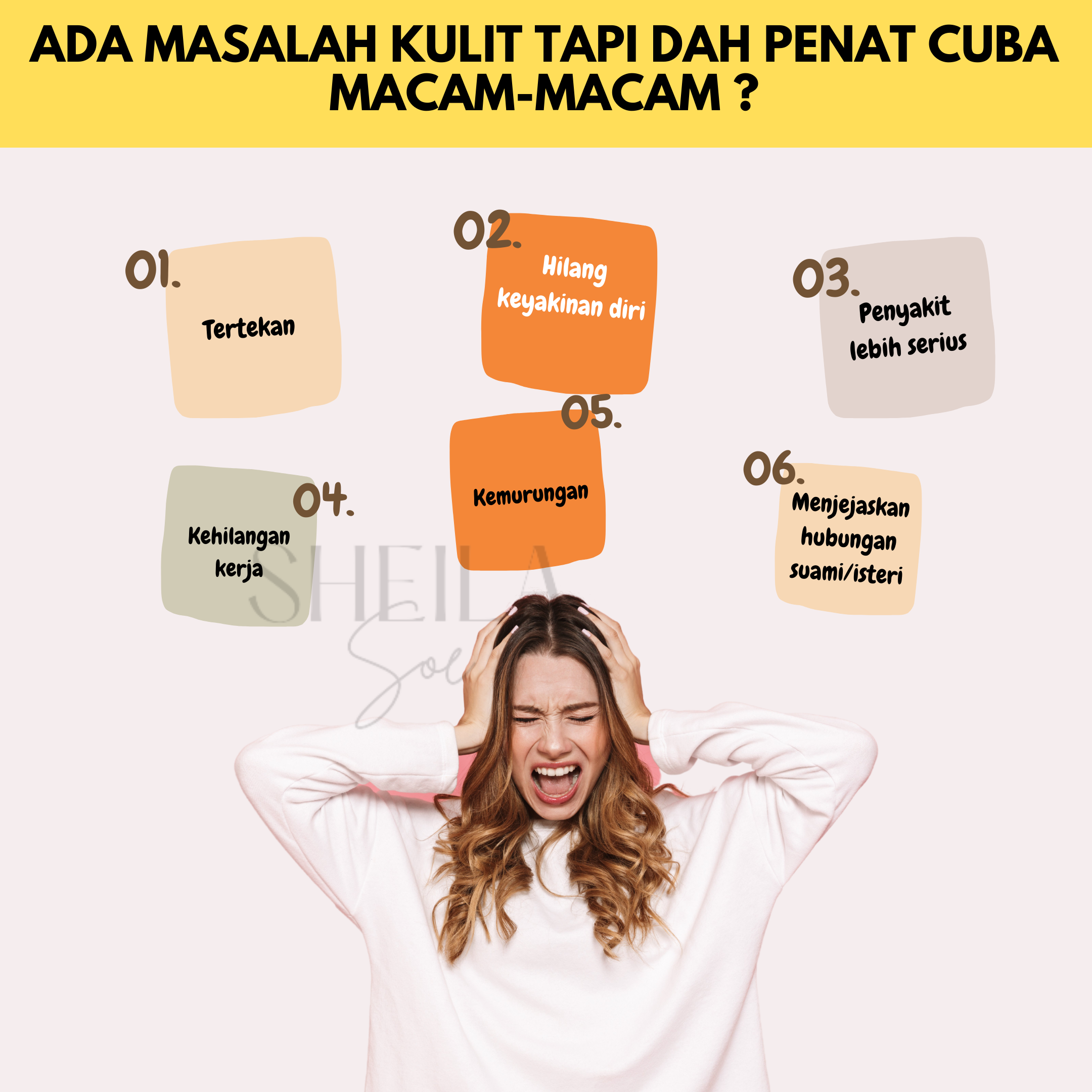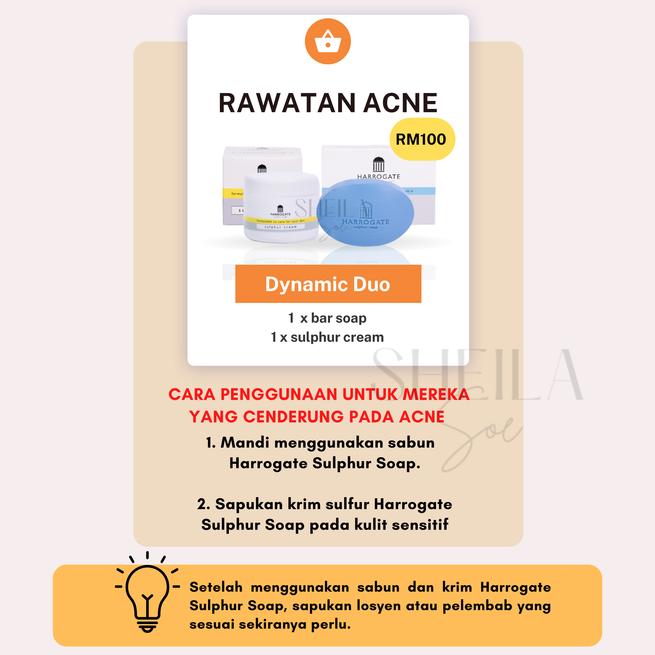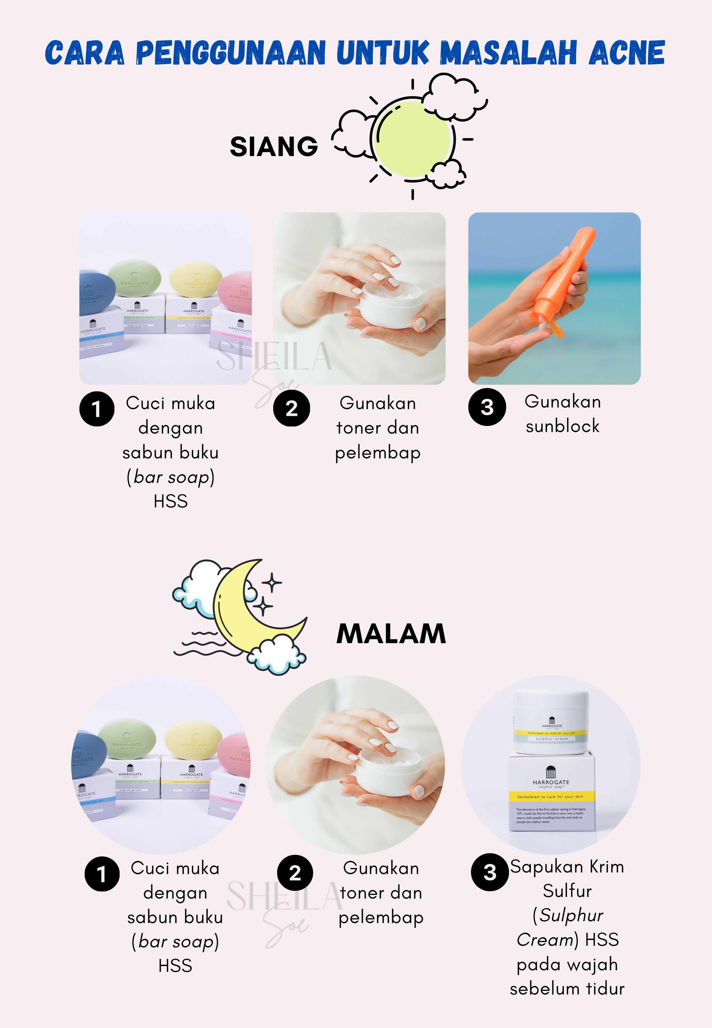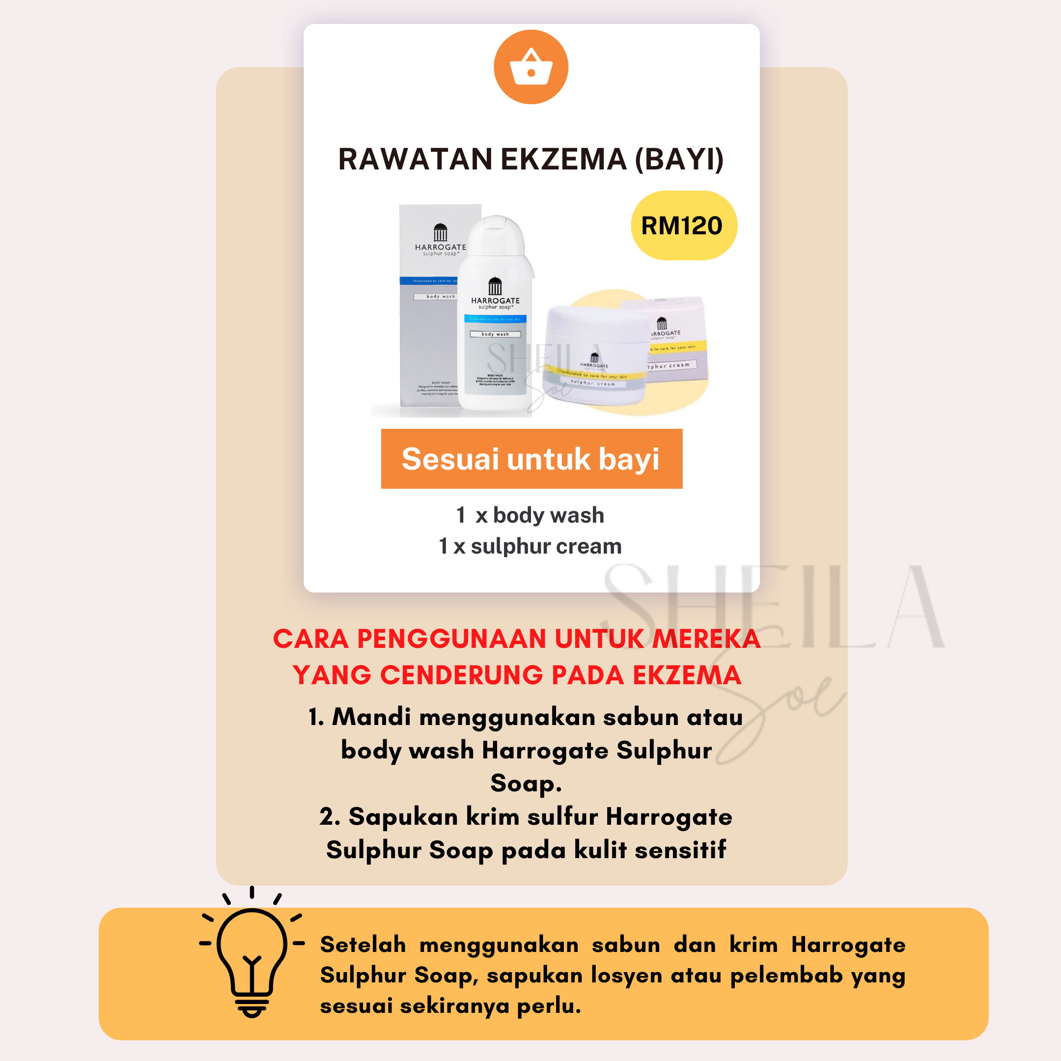 Untuk merawat masalah kulit seperti ekzema, psoriasis dan jerawat, anda dinasihatkan menggunakan bar soap & krim sulfur. Ini kerana, penggunaan kedua-dua produk ini secara konsisten dapat membantu memulihkan masalah kulit anda dengan berkesan.