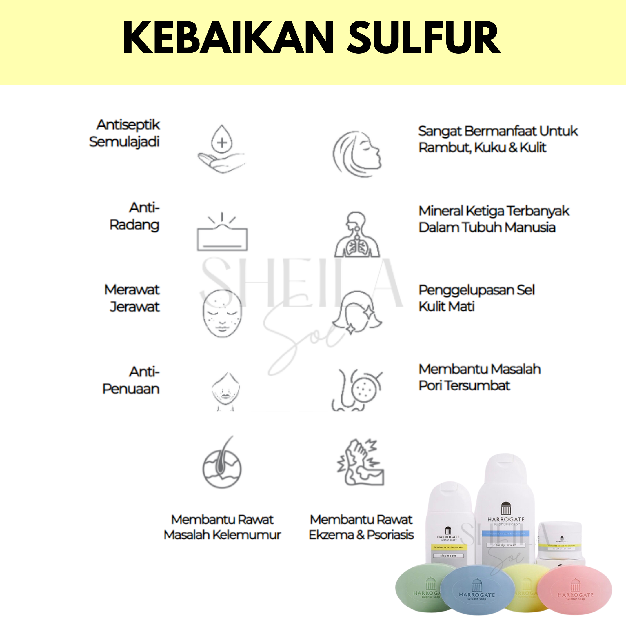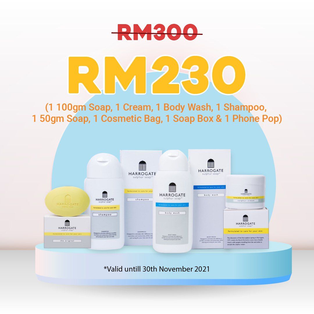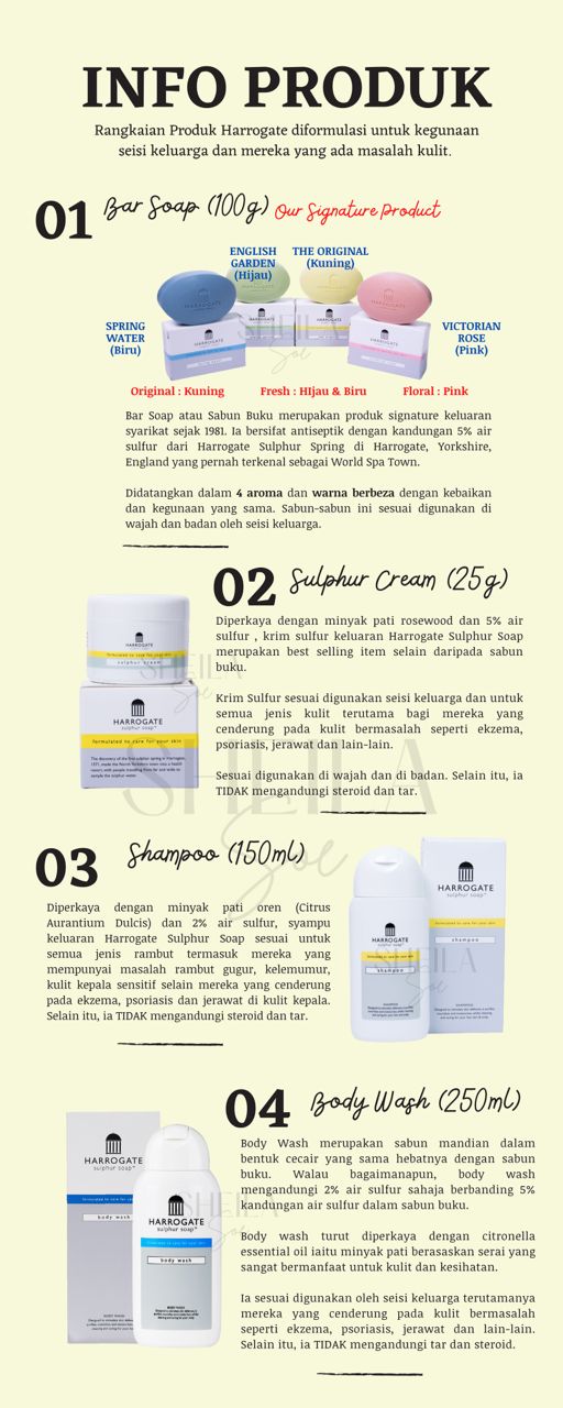 Bagi memastikan semua orang dapat menikmati kebaikan mineral semulajadi yang luar biasa ini, Harrogate Sulphur Soap membawakan kepada anda rangkaian penjagaan kulit yang lengkap berasaskan air sulfur dari World Spa Town, Harrogate, York, England, selain turut diperkayakan dengan vitamin E dan minyak pati ianya mudah dan selamat digunakan setiap hari oleh semua jenis kulit terutamanya mereka yang cenderung pada ekzema, psoriasis dan kulit berjerawat.